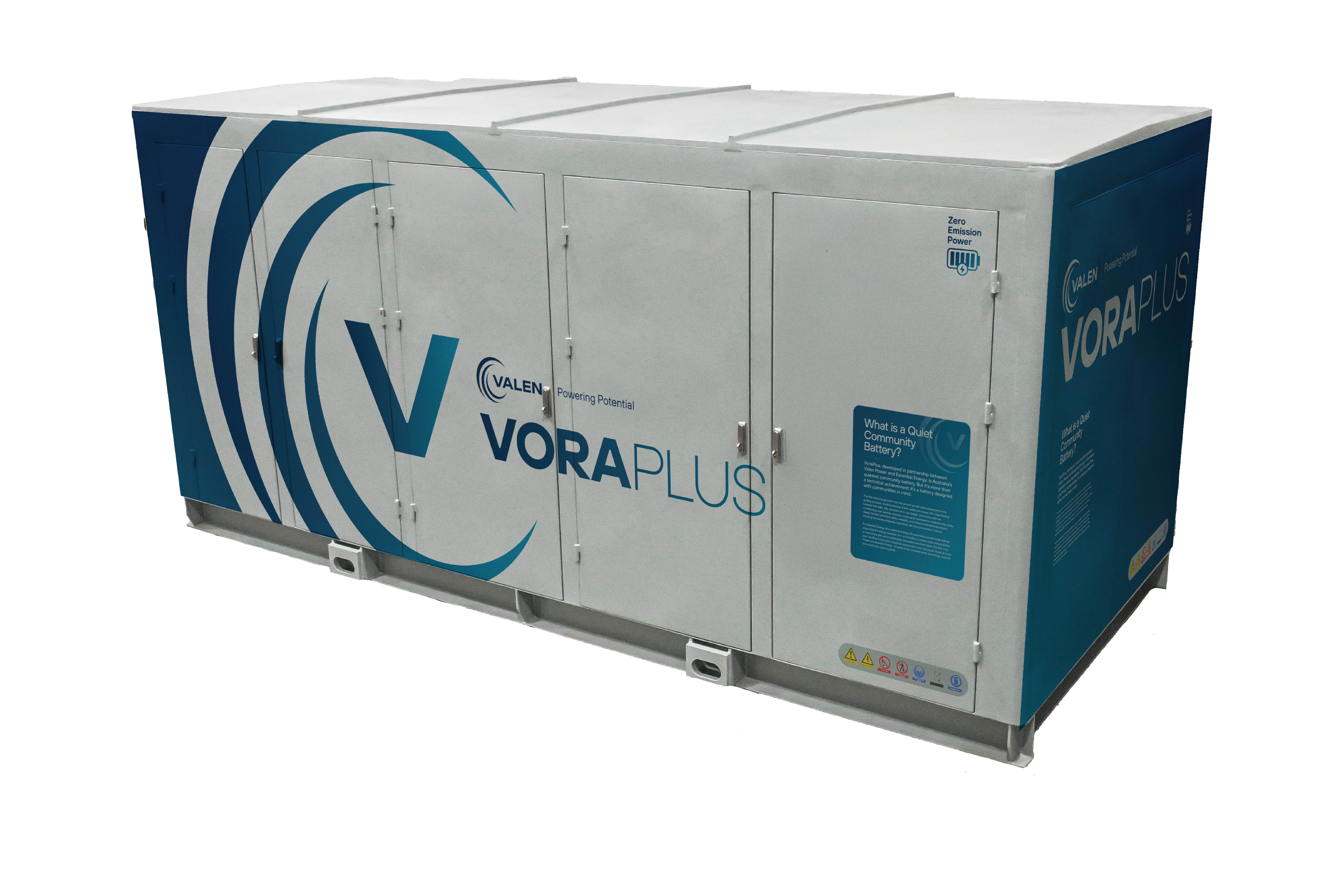 Valen’s VoraPlus is Australia’s only community battery that has been developed with noise mitigation, fast deployment and ease of integration, monitoring and maintenance. Valen’s VoraPlus has been developed from scratch with noise mitigation as the key driver. A fully engineered, double-wall enclosure, mass loading and component choices reduce noise levels by up to 40% based on current models.